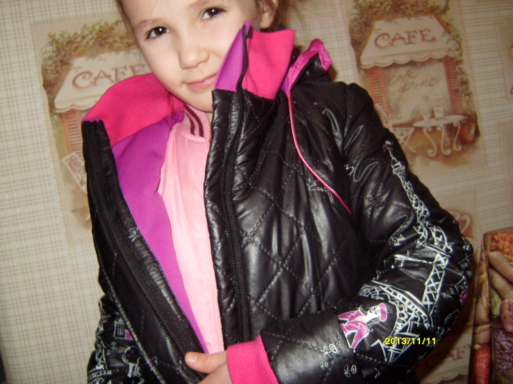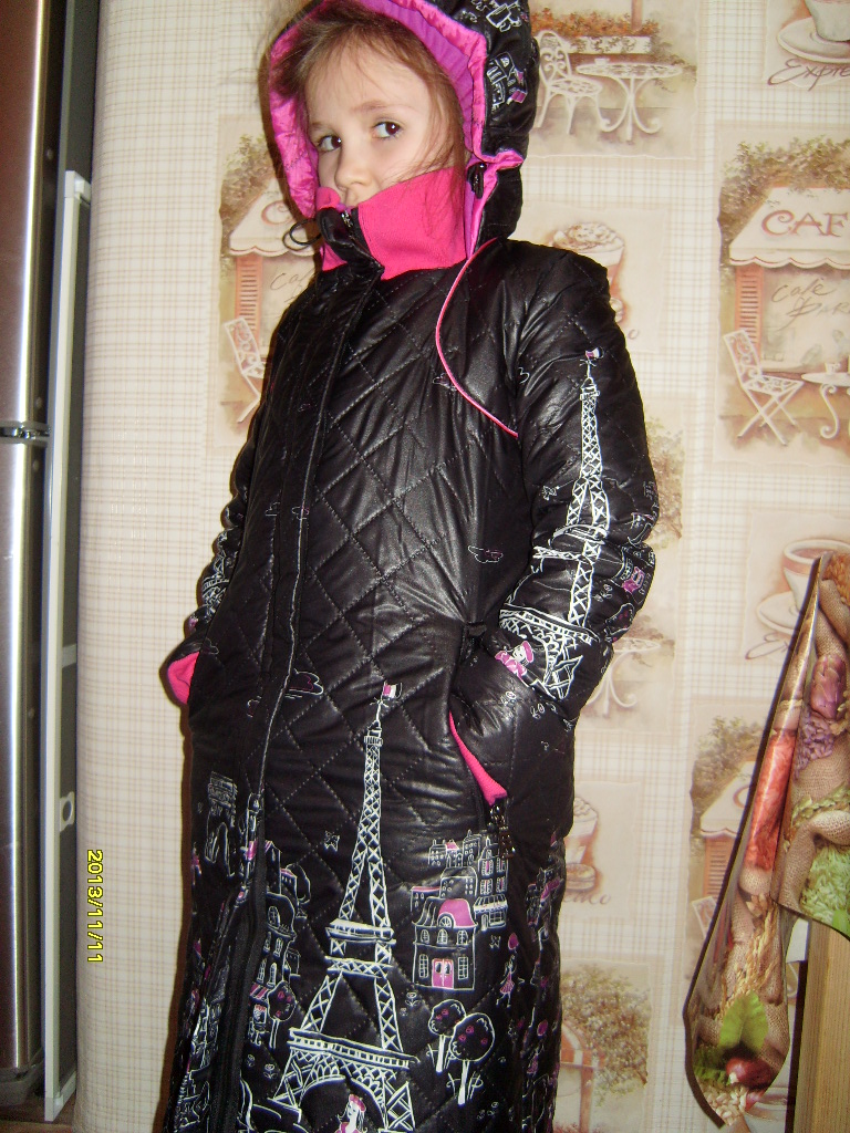 это уже примерка на дутую пуховую жилетку, поэтому дочь смотрится такой плотненькой)))
