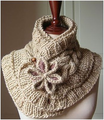 когда связала нужную длину, набираешь петли по кругу (по периметру шарфика ) и вяжешь резинку 2 лицевых 2 изнаночных. и так по кругу примерно 8 рядов. цветок вяжется отдельно. Можно сделать пуговицу вместо спицы - застегивать шарфик.