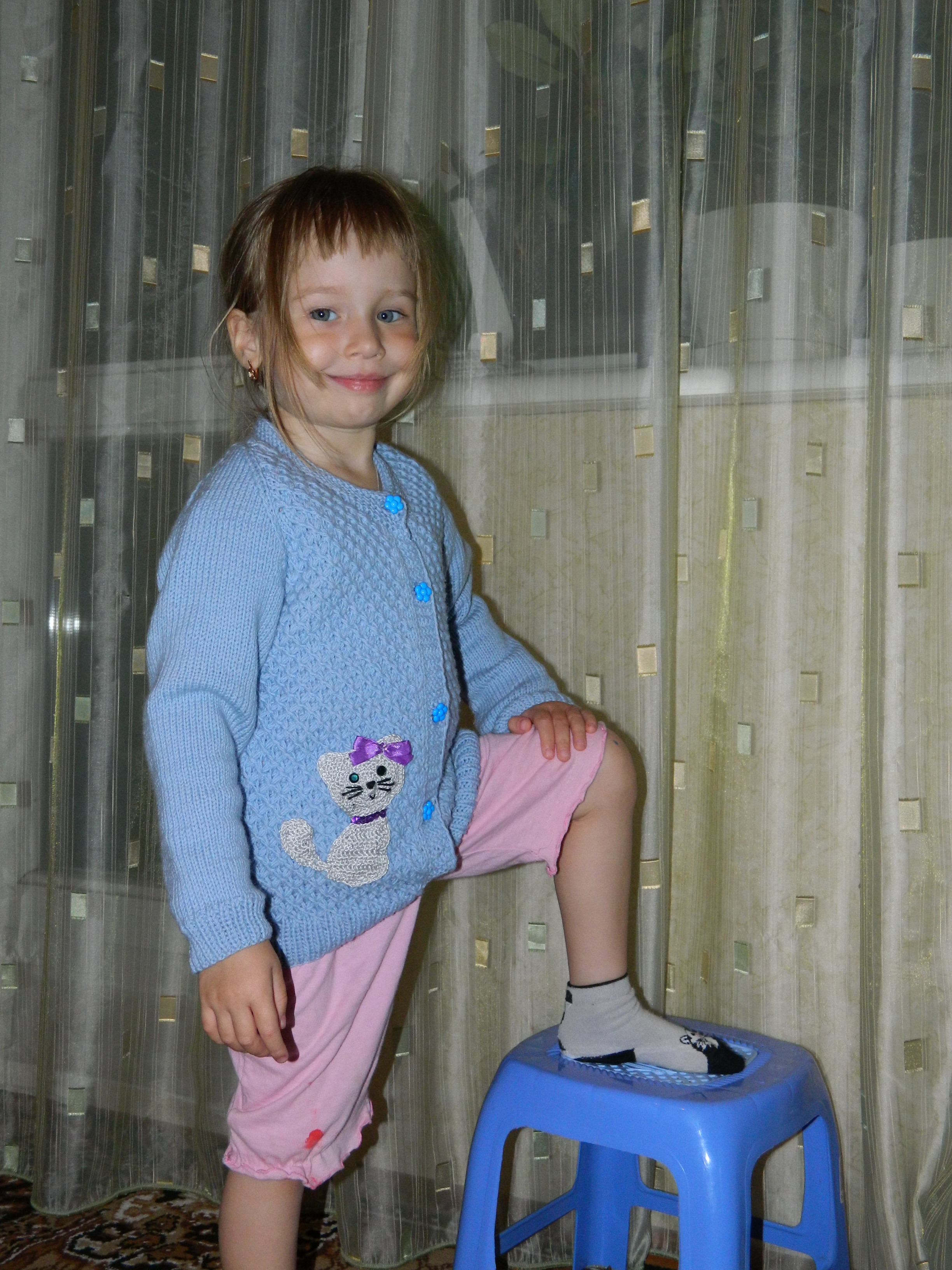 Туничка супер! А Аня прямо модель маленькая! Кофточка с любимой Аниной кисой