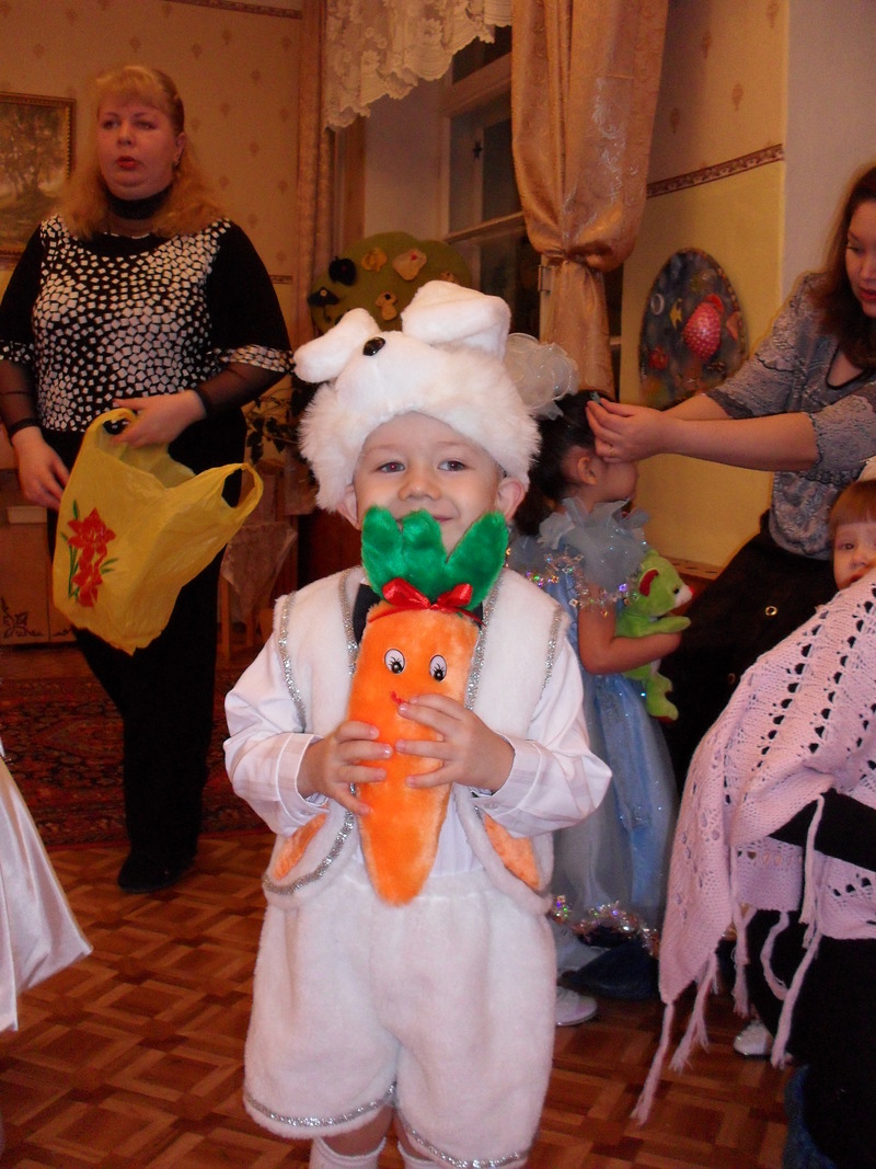 Почему-то это единственная фотка Борина с утренника (здесь ему 4 года) и плохо видно... Я на жилетку нашивала морковки с двух сторон из меха, ну и в руки шила для разнообразия))
