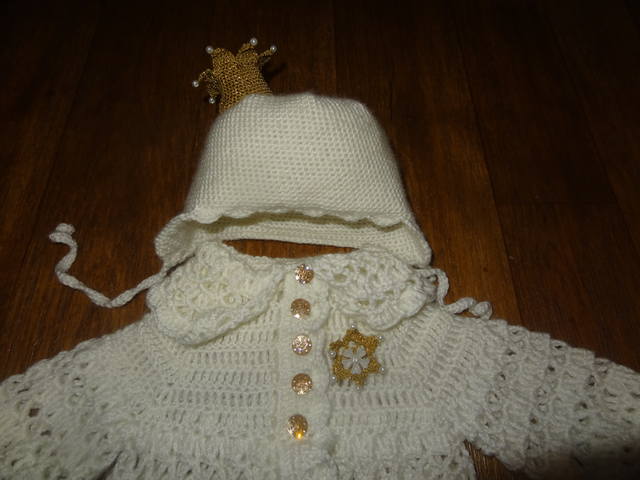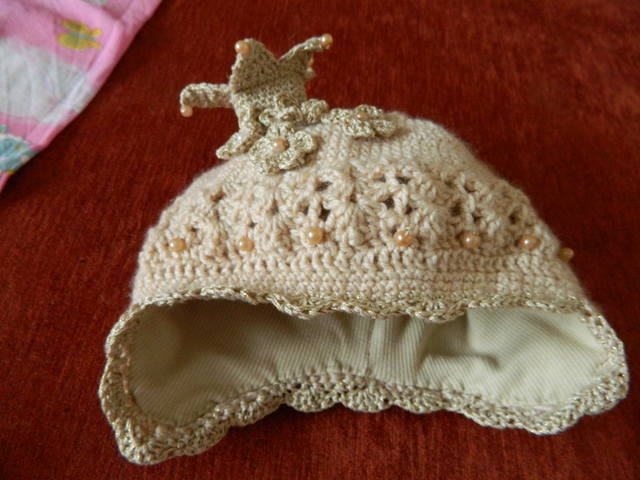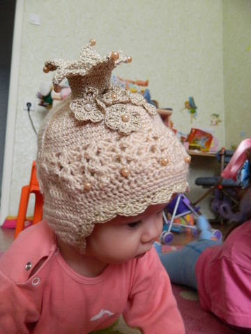 Милана очень просила надеть на нее шапочку ( корона понравилась), поэтому пришлось и ей корону вязать, но вязала на большее количество петель и в высоту больше, в итоге мне не нравится как она форму держит, надо новую делать.