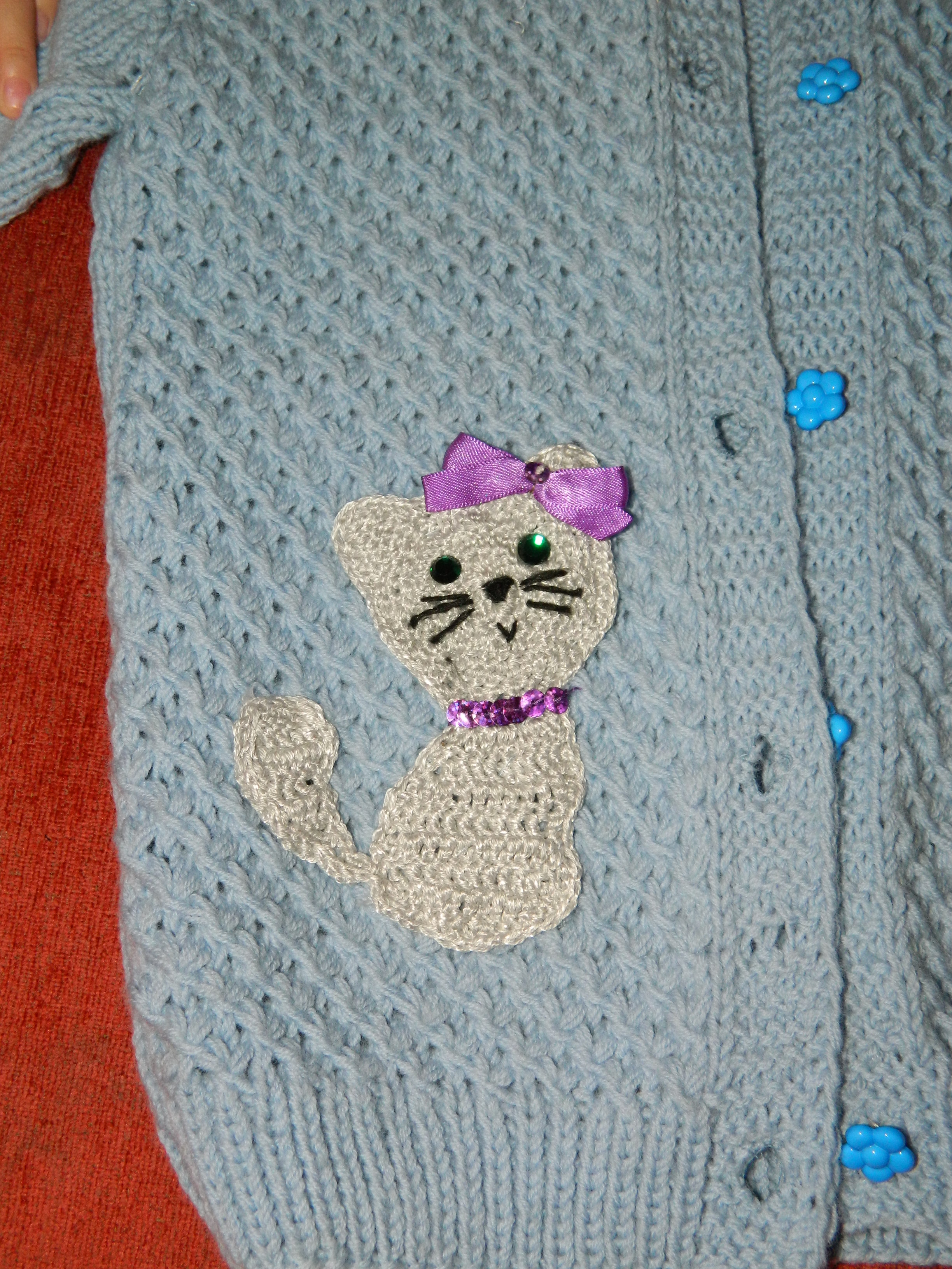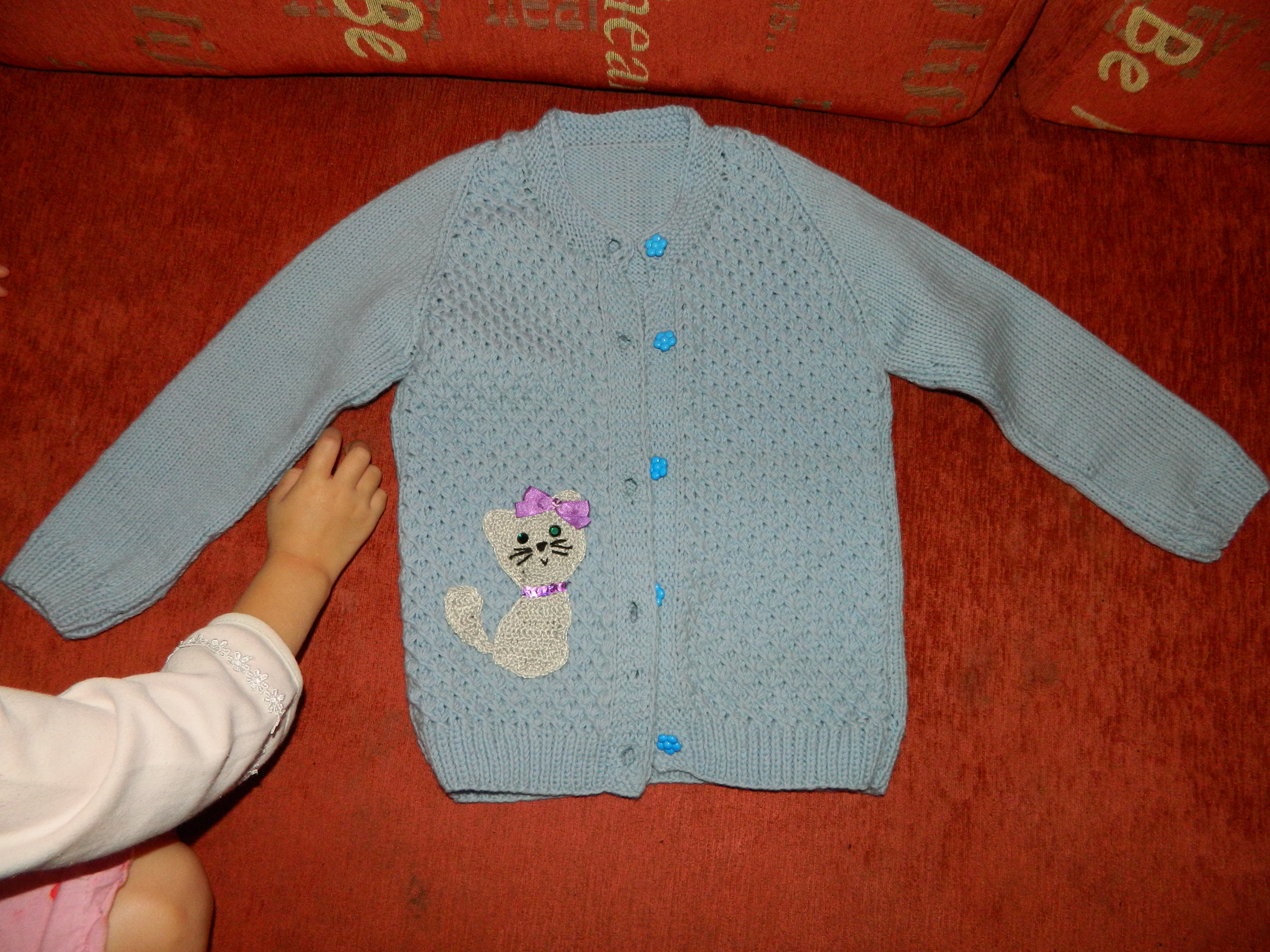 спасибо девочки. да, бабуля у нас молодец. вчера вот привезла ещё один свитерок с кошкой уже вывязанной спицами