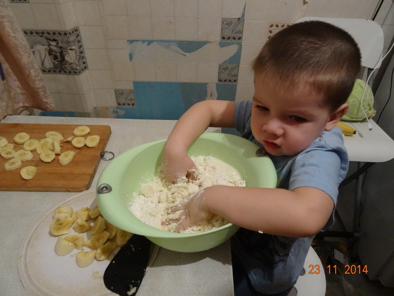 Один из моментов - дети нарезали бананы, потом Егор месил тесто))