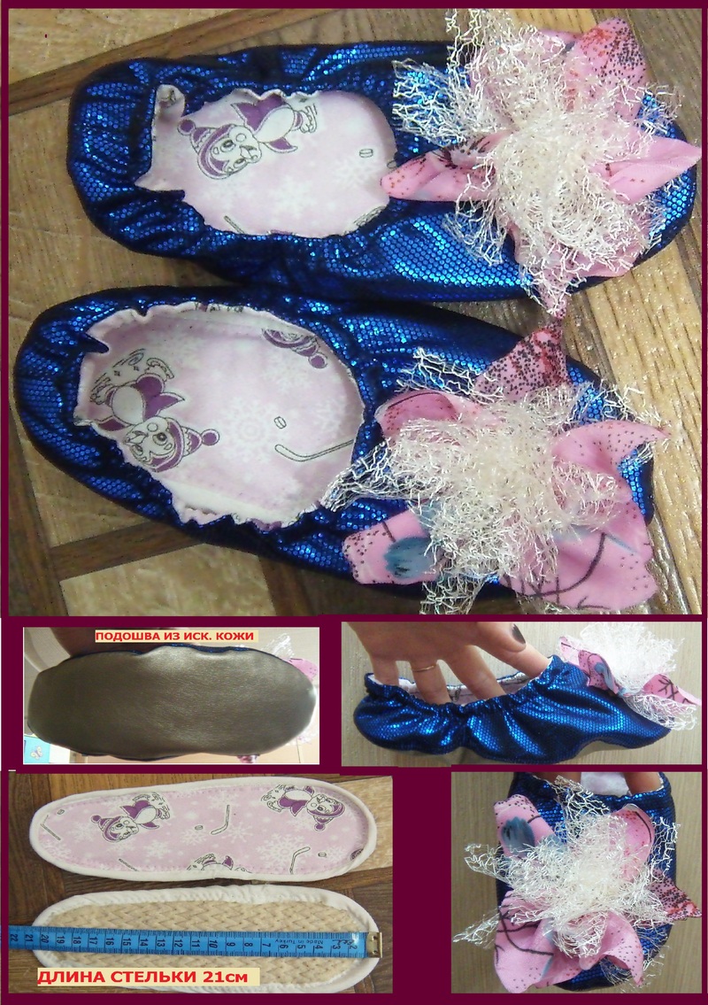 Балетки-тапочки для дома. 200 рублей. Подошва из искусственной кожи, стелька х/б на ватине, внутренняя поверхность трикотаж 100% х/б. Длина стельки 21 см (33 размер).