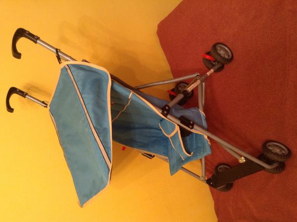 Коляска-трость, в очень хорошем состоянии. Козырёк можно откинуть или снять, задние колёса с тормозами, передние поворотные. 250 руб