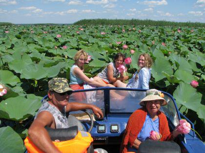 Дельта Волги - самая северная точка распространения этого растения на земном шаре. Озеро лотосов - это огромные, чуть не в метр диаметром, круглые, кожистые листья, темно-зеленые, с синеватым, словно восковым налетом сверху, серовато-зеленые снизу. А над ними, на высоких и крепких стеблях, поднимаются сотни изумительных цветов разнообразных оттенков: от ярко розового до совершенно белого.