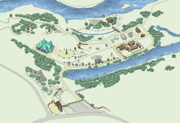 В своей планировке архитектурный ансамбль воссоздает структуру древнеславянских поселений, когда жилые строения окружали центральную площадь.